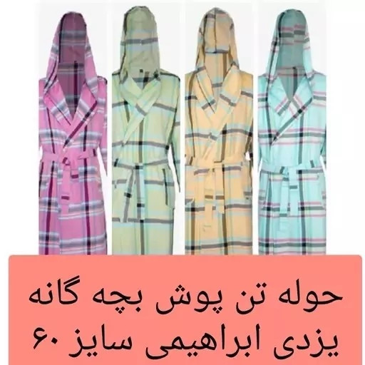 حوله کودک تن پوش کلاهدار یزدی بچه گانه برند ابراهیمی سایز 60 حوله یزدی تن پوش کودک نخی جنس 100 درصد نخ کد ۸۱۹۵
