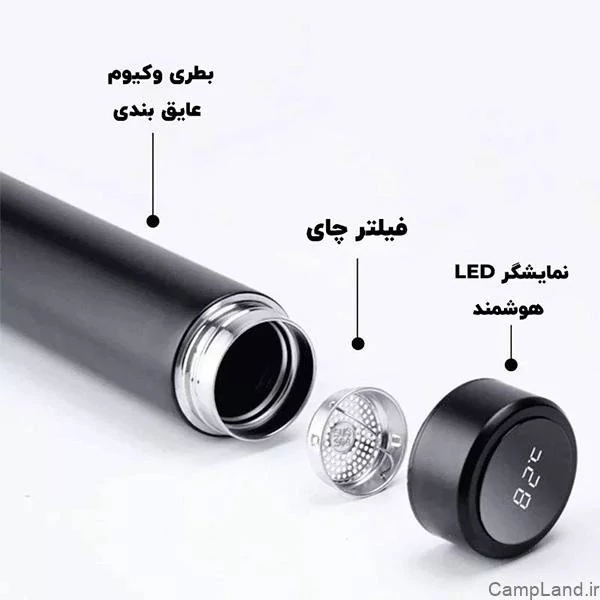 ابعاد:8*25 سایر توضیحات:بسیار کاربردی و باکیفیت در ضمن محصولات ما قبل ارسال تست میشود تا از سالم بودن آن اطمینان حاصل شود مناسب برای:کمپینگ و مسافرت و کوهنوردی جنس:استیل درباره محصول همراه داشتن یک فلاسک هوشمند در برنامه های طبیعتگردی، کوهنوردی و کمپینگ به شما کمک می کند تا براحتی چای یا قهوه خود را بموقع نوش جان کنید و همیشه مراقب دمای آن باشید. این فلاسک هوشمند با استفاده از سنسور سنجش دمایی که دارد به راحتی با یک ضربه روی درب آن دمای مایع درون خود را به شما نشان می دهد. جنس این فلاسک هوشمند از استیل 304 بوده و بخوبی قابل استفاده برای مایع گرم و سرد قابل استفاده است. استفاده از توری که روی درب آن تعبیه شده به شما در هنگام استفاده از چای یا دمنوش کمک می کند تا تفاله ها وارد لیوان شما نشود. باتری این فلاسک یک باتری ساعتی است که براحتی می توانید بعد از اتمام آن را عوض کنید.