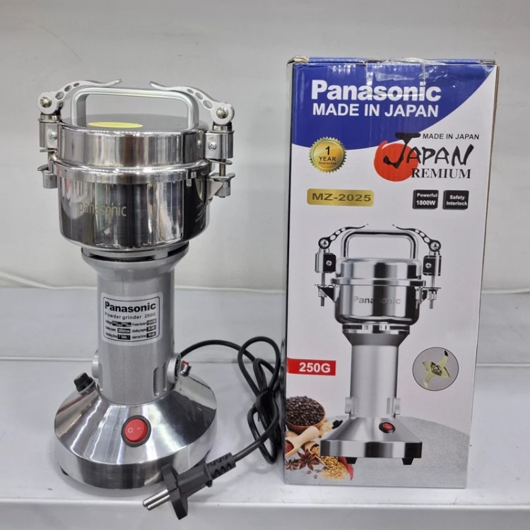پاناسونیک 250 گرمی اصلی سیم پیچ موتور تمام مس ژاپنی مجهز به فیوز و میکروسوییچ قطع کن حجم مخزن 250 گرمی قدرت موتور1800 جنس تیغه تیتانیوم 6 پر طلایی سنگ شکن دارای فیوز اضافه دارای تیغه زاپاس قابلیت پودر کردن سنگ نمک،چوب دارچین ،زجبیل و …