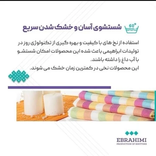 ابعاد:قد حوله از سرشانه تا زیر زانو 125 سانتیمتر است درباره محصول حوله پالتویی ابراهیمی یزد مدل T11 سایز 125 xl ( ایکس لارج ) جنس الیاف طبیعی(سلولزی) ویسکوز سایز سایز S 34-38 اسمال سایز M 38-42 مدیوم سایز L 42-48 مدیوم سایز 48 به بالا XL ایکس لارج سایر توضیحات – 100% نخ طبیعی – 100% رنگ ثابت (راکتیو ) – جذب بسیار بالای آب – شستشوی آسان( شستشو حتی با آب داغ ) – نرمی و لطافت ویژه – خشک شدن سریع – سبک و کم حجم شاید گاهی برایتان اتفاق افتاده باشد که هنگام مسافرت از بس چمدانتان پر بوده نتوانستید حوله لباسی شخصی خود را با خود ببرید چون حجم زیادی را اشغال میکرده و شمکل ساز بوده است از ویژگی های برجسته حوله تنپوش پیش روش شما این است که حجم بسیار کمی دارد و این موضوع به خاطر متریال و ماده تشکیل دهنده این وله است مواد تشکیل دهنده این محصول ویسکوز یا همان الیاف گیاهی به دست آمده از باقیمانده درختان، گیاهان و .... هست که علاوه بر این که فوق العاده جنس نرم ولطیفی دارد، شاید به جرات بتوان گفت دو یا سه برابر وزن خود آب جذب میکند به خاطر همان شاید تعجب برانگیز باشد اینکه این حوله با این حجم کم و جنس به این نازکی چه طور میتواند این مقدار آب راجذب کند فقط کافی است یه مرتبه امتحان کنید تا به صداقت ما نسبت به خو اطمینان پیدا کنید نکته حائز اهمیت در این محصول این است که حس خوشایند گرم کنندگی بدن درهنگام استفاده لذت مصرف این محصول را دوچندان میکند پارچههای نخی از الیاف طبیعی گیاهی تهیه میشوند. این پارچههای محبوب به خوبی هوا را در خود جریان می دهند و دوام بالایی دارند. تمامی محصولات تولیدی گروه ابراهیمی نیز از %100 الیاف طبیعی ویسکوز تولید شده است. محصولات پرطرفداری مثل شمدهای یزدی، حوله های تن پوش، حوله های حمام و دستمال های تنظیف که تماما توسط بافندگی ابراهیمی با نخ طبیعی تولید شده است. برای حفظ ظاهر و افزایش دادن عمر مفید این محصولات نخی، باید به نکات مربوط به نگهداری و شستشوی این لباسها دقت کرد که در ادامه به آن اشاره می شود. آبرفت، فقط یکبار!