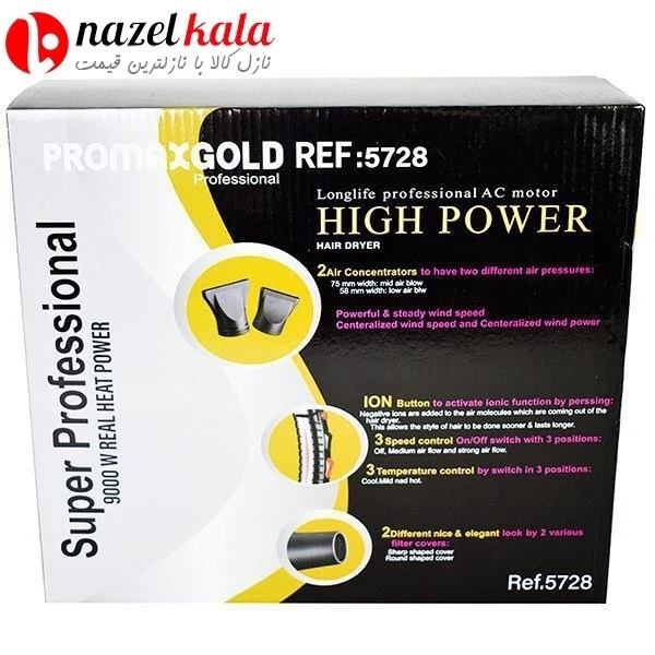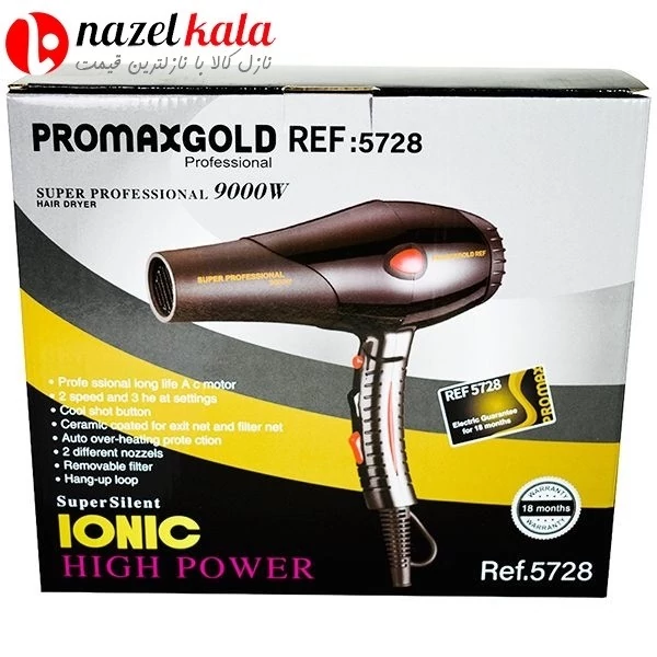 سشوار حرفه ای پرومکس گلدمدل 5728 . ویژگی های محصول سرعت : دو حالته دما : سه حالته فیلتر قابل جدا شدن : دارد سیم گردان با چرخش 360 درجه : دارد طول سیم : 2متر تقویت کنندهی توربو : دارد جنس المنت : سرامیک نوع مصرف : خانگی سری متمرکز کننده باد : دارد