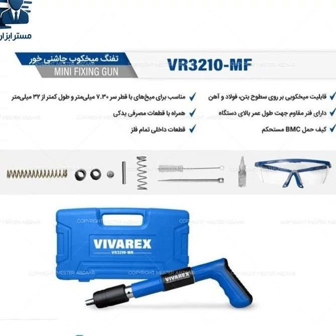 میخکوب چاشنی باروتی سرخود ویوارکس دستی تفنگی با لوازم و کیف مدل VIVAREX VR3210-MF نام : تفنگ میخکوب چاشنی خور برند : ویوارکس (VIVAREX) مدل : VR3210-MF کیف حمل BMC مستحکم همراه با قطعات مصرفی یدکی قطعات داخلی تمام فلز قابلیت میخکوبی بر روی سطوح بتن٬ فولاد و آهن دارای فنر مقاوم جهت طول عمر بالای دستگاه مناسب برای میخ های با قطر سر 7.30 میلی متر و طول کمتر از 32 میلی متر