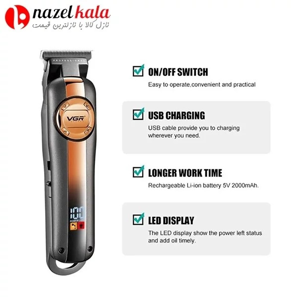 ماشین اصلاح وی جی ار V-941 VGR . ویژگی های محصول وزن: 800 گرم تکنولوژی اصلاح: برش مستقیم جنس تیغه: سرامیک نوع ماشین اصلاح: خط زن مدت زمان شارژ شدن: 3 ساعت مدت زمان استفاده پس از شارژ: 250 دقیقه منبع تغذیه: باطری قابل شارژ، برق مستقیم شهری صفحه نمایش: دارد دکمه توربو: ندارد تعداد شانه (سری): 3 عدد خط زن: دارد صفر زن: دارد تیغه خود تیزشونده: دارد برند: وی جی آر VGR کشور سازنده: جمهوری خلق چین