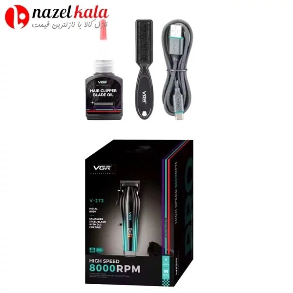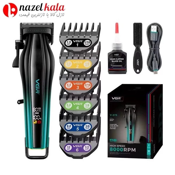 ماشین اصلاح وی جی آر مدل V-273 ویژگی های محصول رضایتمندی:⭐⭐⭐⭐⭐ برند: وی جی آر VGR رنگ بدنه: آبی متالیک طراحی بدنه: تمام فلزی و ارگونومیک نوع باتری: لیتیومی با ظرفیت 3000mAh مدت زمان شارژ کامل: 4 ساعت مدت زمان استفاده پس از شارژ: تا 180 دقیقه سرعت موتور: 8000 دور در دقیقه قابلیت تنظیم سرعت: دارد (5 دنده) تیغهها: استیل ضدزنگ با پوشش DLC مناسب برای: فید، خطزنی، اصلاح حرفهای نوع نمایشگر: دیجیتال با نمایش دور موتور، شارژ، هشدار روغن اقلام همراه: 6 عدد شانه (1.5، 3، 4.5، 6، 9، 12 میلیمتر) روغن مخصوص 30ml برس تمیزکننده بزرگ درپوش محافظ تیغه کابل شارژ تایپ C ولتاژ شارژ: 5V/1A رابط شارژ: USB Type-C نشانگر روغنکاری: دارد قابلیت آویزان کردن: دارد (حلقه مربعی در انتهای بدنه) دکمه توربو و روشن/خاموش مجزا مناسب برای انواع مو: معمولی، ضخیم و حساس مناسب برای: آرایشگران حرفهای و استفاده شخصی سطح بالا تکنولوژی اصلاح: برش مستقیم با تیغه دقیق