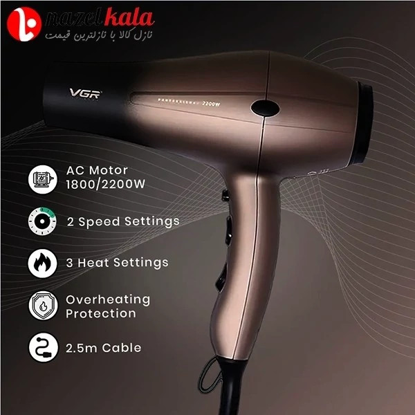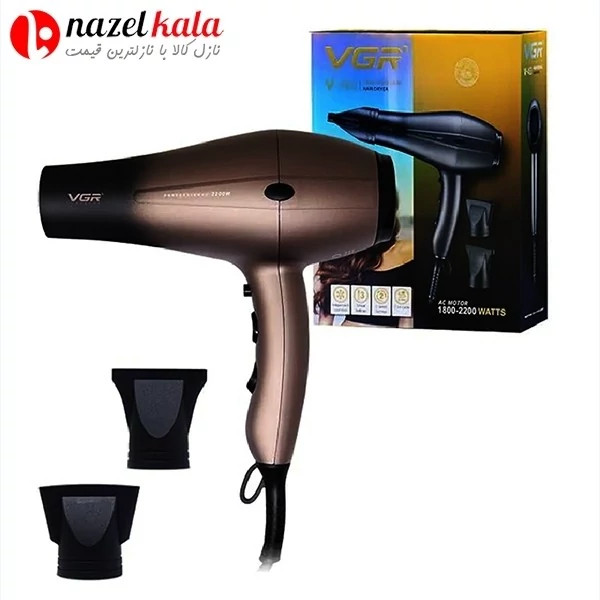 سشوار وی جی آر مدل V-463 . ویژگی های محصول توان موتور: 2000 تا 2200 وات نوع موتور: AC، با طول عمر بالا تنظیمات متنوع: سه حالت دما دکمه باد سرد: برای تثبیت حالت مو فناوری تولید یون: افزایش درخشندگی. طراحی ارگونومیک: دسته راحت برای استفاده طولانی. لوازم جانبی: متمرکزکننده کاربری: استفاده شخصی و حرفهای در سالنها.