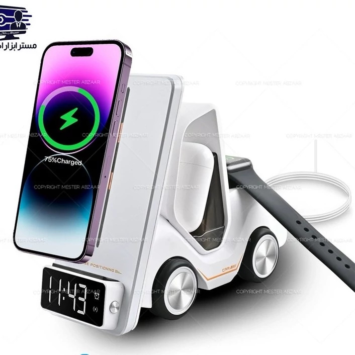 شارژر رومیزی وایرلس هوشمند بیسیم 5 کاره برند اسمارت دسکتاپ مدل SMART DESKTOP T20 موبایل ساعت ایرپاد چراغ طبیعتا برای شما هم پیش اومده که همزمان شارژ گوشی موبایلتان،اپل واچتان و ایرپادتان باهم خالی شده باشد یا عجله داشته باشین و وقت نداشته باشین که گوشی موبایلتان،اپل واچتان و ایرپادتان را به صورت جداگونه برای شارژ قرار بدهید.در این صورت این محصولی که درحال مشاهده آن هستید بهترین گزینه برای شما میباشد.تا الان گجت های زیادی برای گوشی موبایلتان،اپل واچتان و ایرپادتان معرفی شده ولی ترکیب گجتهای مختلف با یکدیگر و ساخت ابزارهای جدید،میتواند نتیجه هیجانانگیز و جذابی داشته باشد؛مخصوصاً وقتی محصول نهایی،کاربردهای جدید و تازهای داشته باشد و پاسخگوی نیاز کاربران باشد.با کابلهای نامرتب خداحافظی کنید . پایه نگهدارنده و شارژر بی سیم گوشی موبایل T20 هم یکی از همین گجتها است.این محصول،ساختار بسیار جالب و منحصر به فردی دارد.پایه نگهدارنده و شارژر بی سیم گوشی موبایل مدل T20 دارای 5 قابلیت جذاب میباشد:-شارژر بیسیم گوشی موبایل.(ظرفیت شارژ 15 وات برای گوشی هوشمند).2-شارژر بیسیم ساعت هوشمند ,وایرلس.(ظرفیت شارژ 2.5 وات برای ساعت هوشمند).3-شارژ بیسیم انواع Airpods(ظرفیت شارژ 5 وات برای هدفون).4-ساعت دیجیتال 5-چراغ خواب طرح چراغ عقب ماشین . پایه نگهدارنده و شارژر بی سیم گوشی موبایل T20 بر خلاف بقیه پایه نگهدارنده ها این قابلیت این را دارد که از این پنج ویژگی به طور همزمان استفاده کنید.اما این همه ماجرا نیست! طراحی منحصربهفرد به شکل لیفتراک، جذابیت خاصی را به هر فضایی اضافه میکند و آن را به فضایی چشم نواز برای خانه یا محل کار شما تبدیل میکند.با تهیه پایه نگهدارنده و شارژر بی سیم گوشی موبایل T20 دیگر خبری از کابل های درهم نیست . در حالی که نور شب یکپارچه محیطی آرامش بخش ایجاد می کند. با شلوغی ها خداحافظی کنید و از کارایی و ظرافت پایه نگهدارنده و شارژر بی سیم گوشی موبایل T20 لذت ببرید.برای استفاده از پایه نگهدارنده و شارژر بی سیم گوشی موبایل T20 کافیست کابل Usb-C را به استند متصل کنید و از پایه نگهدارنده و شارژر بی سیم گوشی موبایل T20 لذت ببرید.