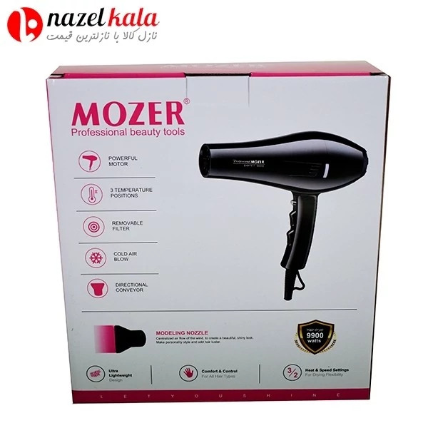 سشوار موزر مدل B-KH1517 ویژگی های محصول ✔️ توان موتور: 9900 وات ✔️ نوع موتور: DC ✔️ تنظیمات سرعت و حرارت: 2 سرعت مختلف 3 حالت حرارتی (سرد، متوسط، گرم) ✔️ کلید باد سرد (Cool Shot): دارد ✔️ فناوری تولید یون: کاهش الکتریسیته ✔️ طول کابل: 2.5 متر ✔️ سری متمرکز کننده هوا: 2 عدد ✔️ طراحی ارگونومیک: دسته راحت و مناسب