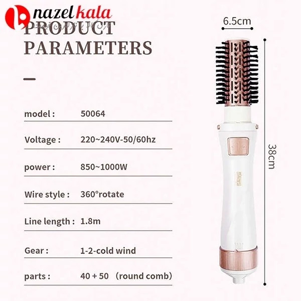 سشوار چرخشی دی اس پی مدل DSP-50064 ویژگی های محصول رضایتمندی:⭐⭐⭐⭐⭐ چرخش دوطرفه برس توان خروجی 1000 وات المنت از جنس سرامیک تورمالین قابلیت تولید باد سرد دو حالت تنظیم سرعت دو سطح تنظیم حرارت طراحی ارگونومیک و خوشدست برسهای قابل تعویض کابل چرخان با طول 1.8 متر مناسب برای صافکردن و حجمدهی مو